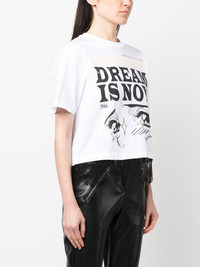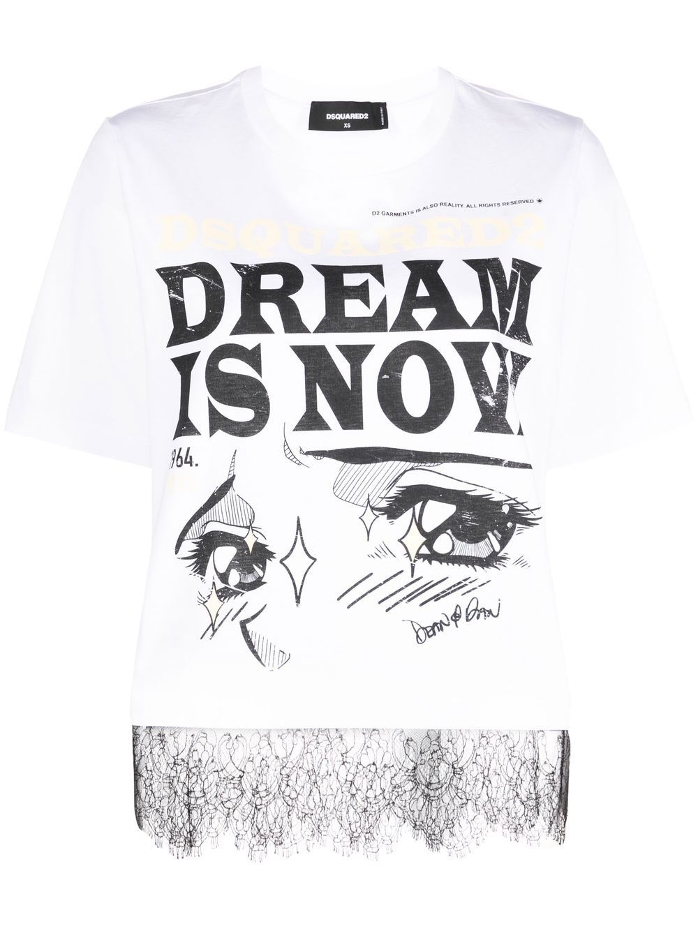 slogan graphic-print T-shirt Dsquared2 makes a statement with this cotton T-shirt, adorned with a graphic and bold slogan print at the front. The lace trim offers a romantic touch to the garment. Highlights - White/black - Cotton - Graphic print to the front - Slogan print - Lace trim - Round neck - Short sleeves Made in Italy Composition Cotton 100%, Polyamide 54%, Viscose 46% SIZE & FIT Model measurements Height 5 ft 10 in(1.78 m) Bust/Chest 31.49 in(80 cm) Hips 36.22 in(92 cm) Waist 25.59 in(65 cm) FittingInformation This piece fits true to size. We recommend you get your regular size Cut for a loose fit Made with a mid-weight fabric Washing instructions Dry Clean Only