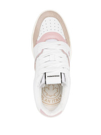 Spiker leather sneakers Dsquared2's Spiker sneakers are reimagined in a white and pastel-pink colourway. The basketball-inspired silhouette is made from smooth leather and accented with suede panels. An iconic maple leaf logo at the sidewall echoes the brand’s Canadian roots. Highlights - White, pink, beige - Calf leather - Panelled design - Round toe - Perforated toebox - Applique logo - Embroidered logo to the side - Padded ankle - Branded insole - Non-slip rubber sole - Front lace-up fastening Made in Italy Composition Leather 100% SIZE & FIT Measurement HEEL 0.98 in(2.5 cm) Sole height 0.78 in(2 cm)