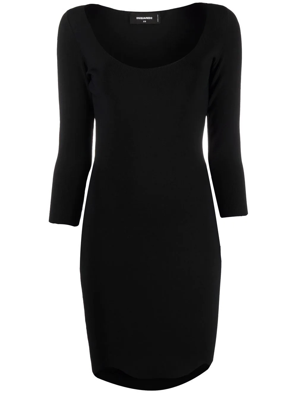 three quarter-sleeved fitted dress black scoop neck three-quarter length sleeves fitted silhouette asymmetric hem above-knee length Made in Italy Composition Viscose 75%, Polyamide 25% SIZE & FIT Model measurements Height 5 ft 10 in(1.79 m) Bust/Chest 33.07 in(84 cm) Hips 35.82 in(91 cm) Waist 24.01 in(61 cm) FittingInformation This piece fits true to size. We recommend you get your regular size Cut for a slim fit Made with a mid-weight fabric Washing instructions Hand Wash