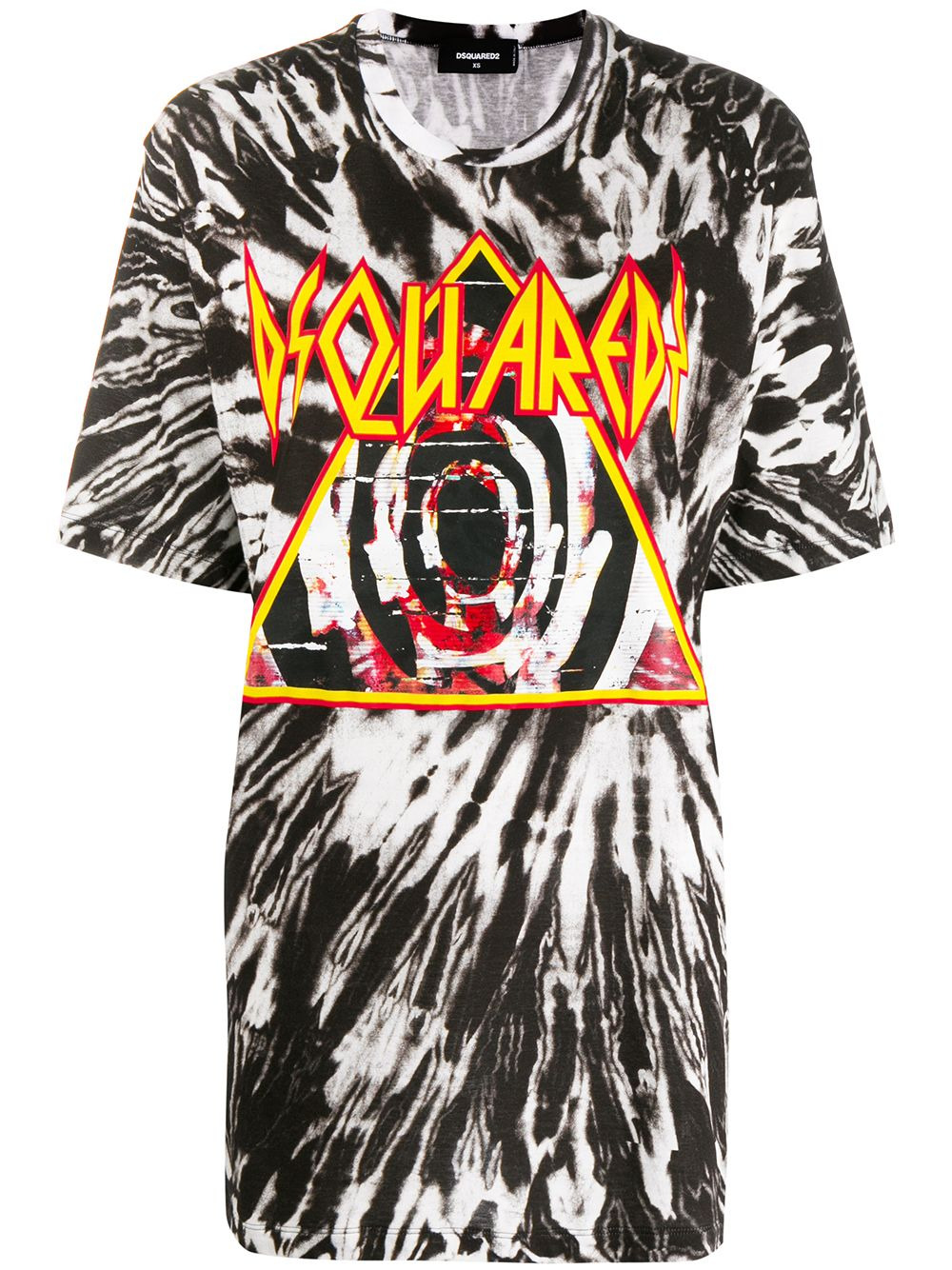 tie-dye print T-shirt The 1990s called. They want their Dsquared2 tie-dye print T-shirt back but we say - good luck trying to get it off you! You and this T-shirt are joined at the hip now. Maybe they'll accept your old Nokia phone instead... Featuring a printed logo to the front, a crew neck, short sleeves, a straight hem and a long length. Made in Italy Composition Cotton 100% SIZE & FIT Model measurements Height 5 ft 10 in(1.78 m) Bust/Chest 32.67 in(83 cm) Hips 35.82 in(91 cm) Waist 24.01 in(61 cm) FittingInformation This piece fits true to size. We recommend you get your regular size Cut for a relaxed fit Washing instructions Do Not Wash/Do Not Dry Clean
