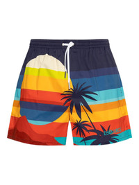 tropical landscape swim shorts Highlights - Navy blue - Multicoloured horizontal stripes - Palm tree graphic - Elasticated waistband - Drawstring fastening - Logo detail on hem - Be mindful to try on swimwear over your own garments. Made in Italy Composition Polyester 95%, Elastane 5%