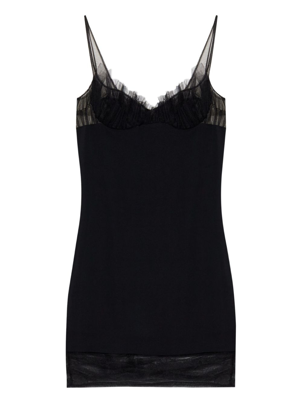 tulle-trim mini dress Highlights - Black - Tulle trim - Thin shoulder straps - Zip fastening - Ruffled detailing - Straight hem Made in Italy Composition Outer: Viscose 95%, Spandex/Elastane 5% Washing instructions Read Manufacturer Guidelines