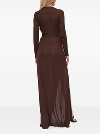 v-neck dress Highlights - Brown - V-neck - Long sleeves - Side slit - Belted waist Made in Italy Composition Viscose 95%, Elastane 5% Washing instructions Read Manufacturer Guidelines