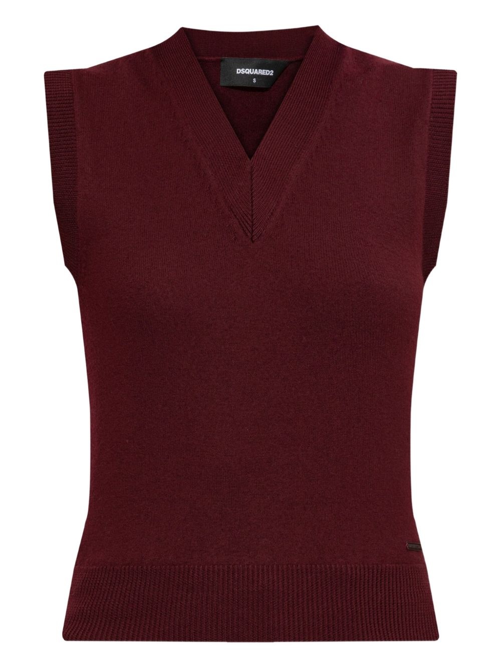 V-neck sleeveless wool top Highlights - Burgundy - V-neck - Sleeveless - Wool knit - Cropped hem - Logo label Made in Italy Composition Virgin Wool 100% Washing instructions Read Manufacturer Guidelines