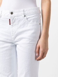 White Bull cropped jeans Highlights - White - Stretch-cotton - Logo patch to the rear - High-waisted - Belt loops - Concealed fly and button fastening - Logo tag - Cropped leg - Classic five pockets Made in Italy Composition Outer: Cotton 98%, Spandex/Elastane 2% Lining: Cotton 100% SIZE & FIT Model measurements Height 5 ft 11 in(1.8 m) Bust/Chest 31.49 in(80 cm) Hips 35.43 in(90 cm) Waist 24.4 in(62 cm) FittingInformation Designed with a flared hem, these trousers allow for a close fit at the waist with a slim fit over the leg and widening towards the hem Cropped in length Constructed from stretch denim, this piece offers a stretch fit with durability This piece fits true to size – take your usual size Washing instructions Machine Wash