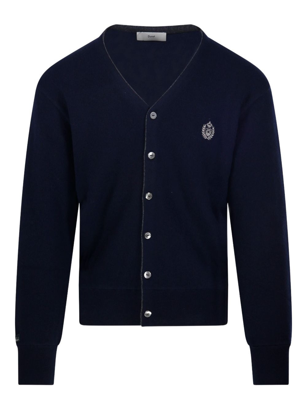 crest-embroidered cardigan Highlights - Blue - V-neck - Front button fastening - Long sleeves - Crest embroidery Imported Composition Polyester 80%, Wool 20% Washing instructions Read Manufacturer Guidelines