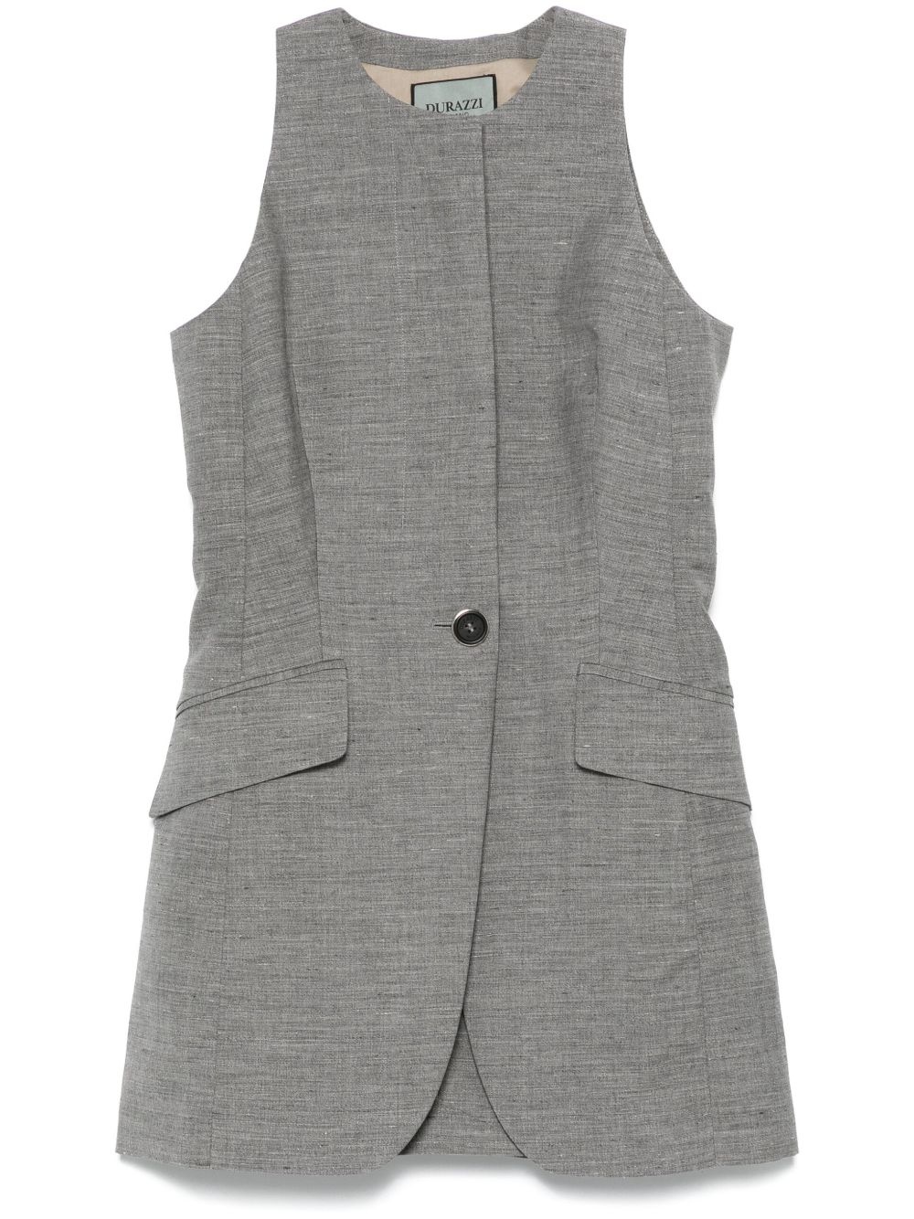 tailored waistcoat Highlights - Battleship grey - Front button fastening - Two front flap pockets - Crew neck - Sleeveless Made in Italy Composition Virgin Wool 52%, Linen/Flax 48% SIZE & FIT Model measurements Height 5 ft 11 in(1.8 m) Bust/Chest 31.49 in(80 cm) Hips 36.61 in(93 cm) Waist 24.4 in(62 cm) FittingInformation Designed for a slim fit that sits just away from the body offering a close yet comfortable fit The vented hem offers movement at the rear Made from a midweight non-stretch fabric