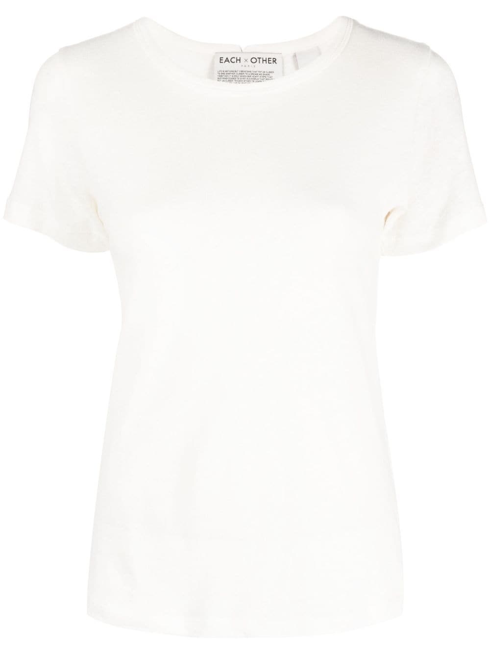 round neck T-shirt Highlights - Off-white - Cotton-linen blend - Round neck - Short sleeves - Straight hem Imported Composition Linen/Flax 50%, Cotton 50% SIZE & FIT Model measurements Height 5 ft 10 in(1.78 m) Bust/Chest 31.49 in(80 cm) Hips 37 in(94 cm) Waist 23.62 in(60 cm) FittingInformation Designed for a slim fit that sits just away from the body offering a close yet comfortable fit Made with a midweight knit, this piece offers some stretch This piece fits true to size – take your usual size