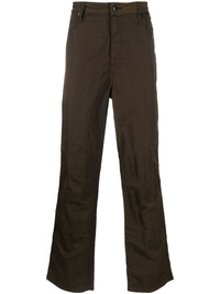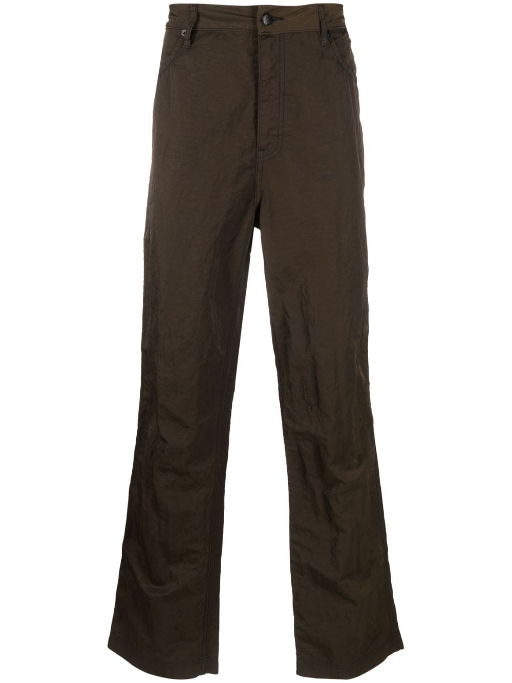 crinckled-finish straight-leg trousers Cut from a garment-washed technical fabric, these trousers showcase Eckhaus Latta's consideration for texture, tactility and garment construction. They're cut for a straight-leg fit and boast the brand's signature L-shaped pockets. Highlights - Moss green - High waist - Crinkled finish - Button fly fastening - Two rounded pockets to the sides - Two rear patch pockets - Straight hem - When buying this unisex item, keep in mind that it is graded in standard men's sizing. Made in United States Composition Nylon 100% SIZE & FIT Model measurements Height 5 ft 10 in(1.78 m) Bust/Chest 33.46 in(85 cm) Hips 36.22 in(92 cm) Waist 23.22 in(59 cm)