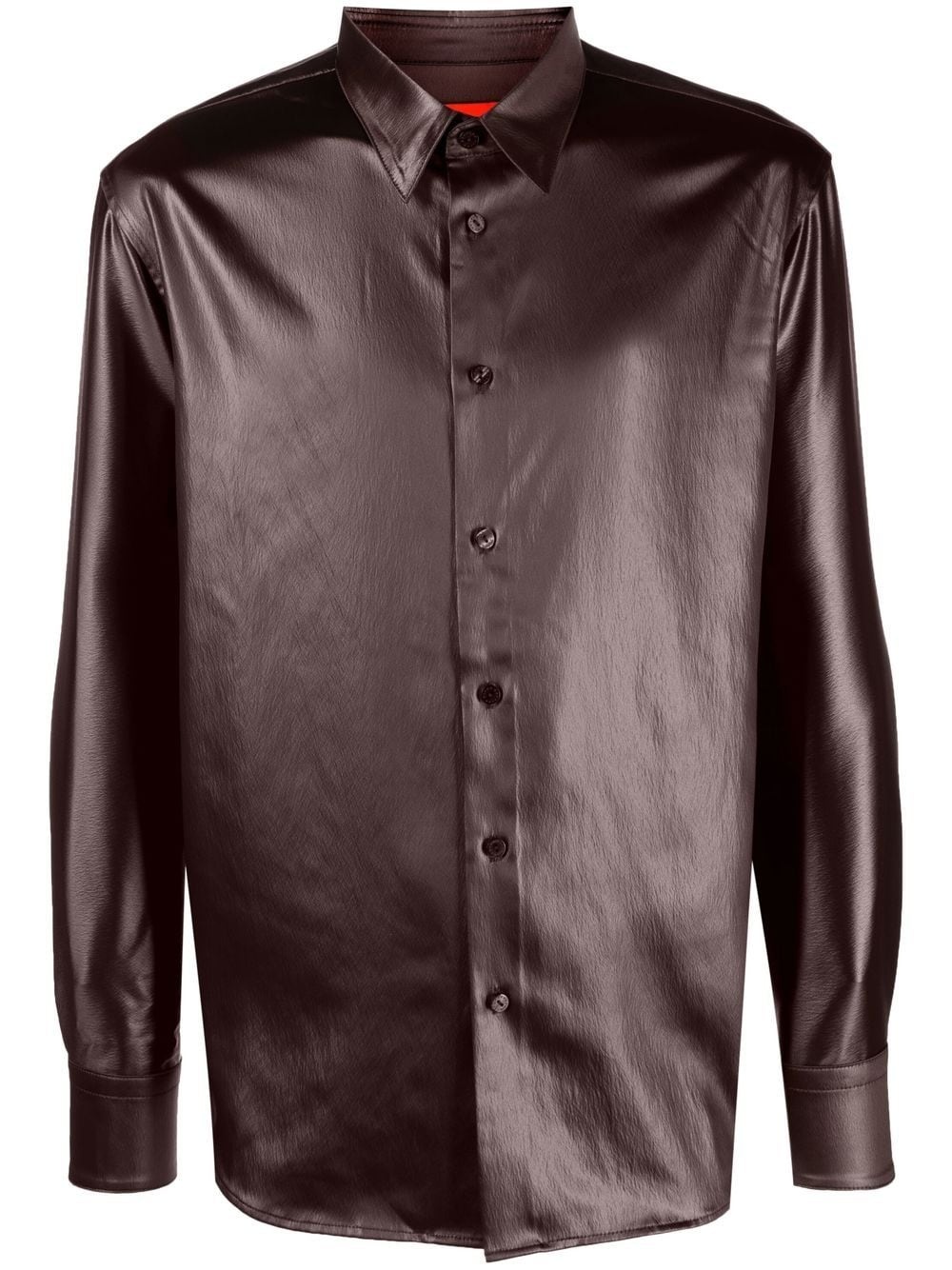 metallic long-sleeve shirt chocolate brown metallic finish grained texture straight-point collar front button fastening long sleeves buttoned cuffs curved hem Imported Composition Polyester 100% SIZE & FIT Model measurements Height 6 ft 2 in(1.89 m) Bust/Chest 37.4 in(95 cm) Hips 35.03 in(89 cm) Waist 27.95 in(71 cm) FittingInformation This piece fits true to size. We recommend you get your regular size Cut for a slim fit Made with a lightweight non-stretch fabric