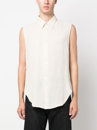 open-back sleeveless shirt Highlights - Cream white - Cotton-linen blend - Open back - Classic collar - Front button fastening - Rear tie fastening - Sleeveless - Curved hem - When buying this unisex item, keep in mind that it is graded in standard men's sizing. Imported Composition Cotton 54%, Linen/Flax 46% SIZE & FIT Model measurements Height 5 ft 10 in(1.79 m) Bust/Chest 33.07 in(84 cm) Hips 35.82 in(91 cm) Waist 24.01 in(61 cm) FittingInformation This unisex piece is designed for a slim fit whether you usually select women's or men's sizes The tie fastening gives an adaptable and personalised fit Made from a midweight non-stretch fabric Washing instructions Hand Wash