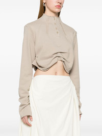 Amish sweatshirt Highlights - Taupe - Cotton - Jersey texture - Front button placket - High neck - Long sleeves - Split cuffs - Gathered detailing at the hem - French terry lining - Raw-cut hem - Cropped Made in United States Composition Cotton 100% SIZE & FIT Model measurements Height 5 ft 9 in(1.75 m) Bust/Chest 31.88 in(81 cm) Hips 34.64 in(88 cm) Waist 24.01 in(61 cm) FittingInformation Designed for a relaxed fit, this piece allows for comfort and movement when worn Made from a midweight non-stretch fabric, this piece offers minimal elasticity when worn