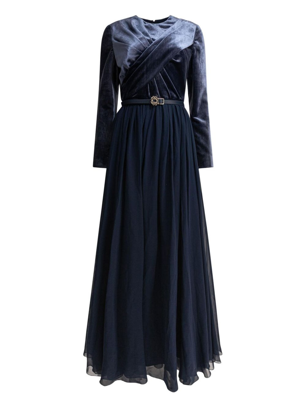 belted dress Highlights - Dark blue - Long sleeves - Belted waist Imported Composition Silk 75%, Viscose 25% Washing instructions Read Manufacturer Guidelines