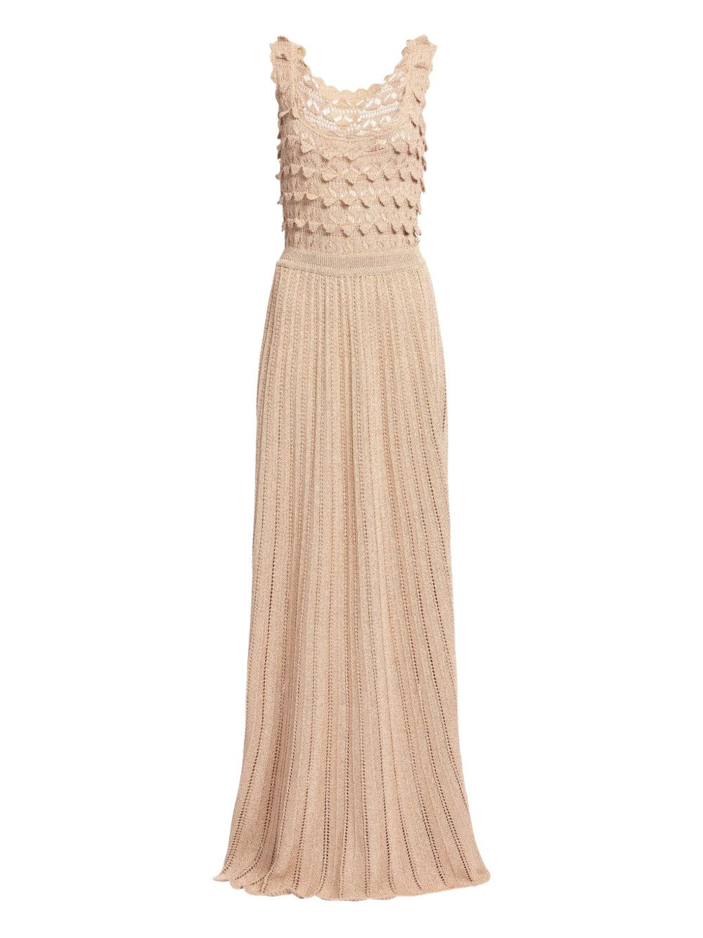 crochet maxi dress Highlights - Gold-tone - Crochet - Sleeveless - Round neck - Ribbed detail - Maxi length Made in Italy Composition Outer: Viscose 80%, Metallised Fibres 20% Washing instructions Read Manufacturer Guidelines