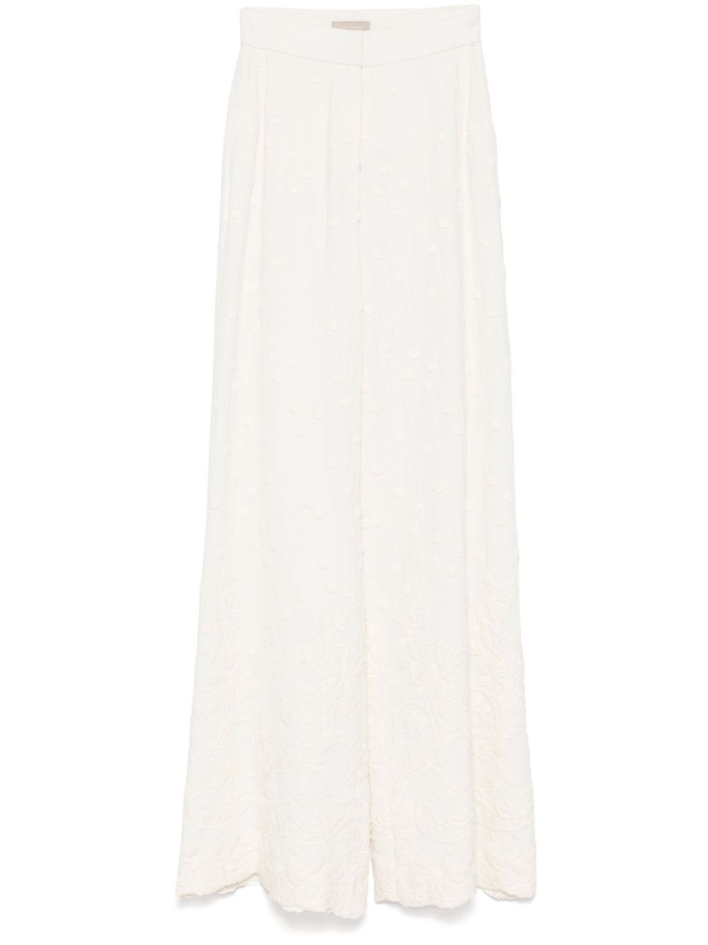 embroidered flared trousers Highlights - Powder white - Silk-cotton blend - Front hook and zip fastening - Embroidered design - Two side inset pockets - Flared hem Imported Composition Outer: Cotton 33%, Viscose 26%, Acetate 24%, Silk 12%, Polyamide 3%, Elastane 2% Lining: Silk 100% Washing instructions Dry Clean Only