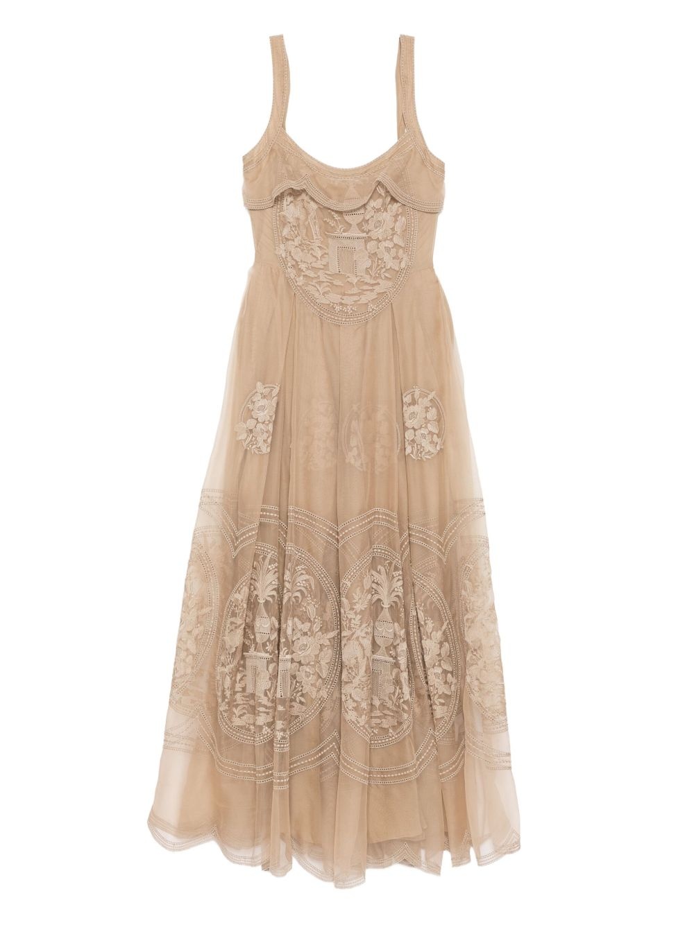embroidered organza long dress Highlights - Beige - Concealed rear hook and zip fastening - Sleeveless - Round neck - A-line Imported Composition Silk 61%, Polyester 39% SIZE & FIT Model measurements Height 5 ft 10 in(1.78 m) Bust/Chest 29.92 in(76 cm) Hips 34.64 in(88 cm) Waist 24.8 in(63 cm) FittingInformation Designed for a close fit at the chest with a loose fit over the waist and hips Made from a midweight non-stretch fabric Washing instructions Dry Clean Only