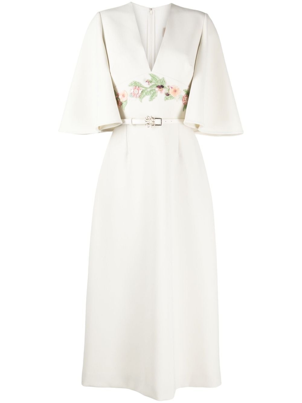 floral-applique midi dress Highlights - White - Silk blend - Floral embroidery - Plunging v-neck - Rear zip fastening - Short draped sleeves - Belted waist - A-line skirt - Straight hem - Mid-calf length Imported Composition Outer: Silk 50%, Polyester 46%, Elastane 4% Lining: Silk 100% SIZE & FIT Model measurements Height 5 ft 10 in(1.77 m) Bust/Chest 31.49 in(80 cm) Hips 35.43 in(90 cm) Waist 25.19 in(64 cm) FittingInformation Designed for a close fit at the chest and waist with a loose fit at the hip The belt offers adjustability for fitted preferences Made from a midweight stretch fabric, this piece offers elasticity and flexibility when worn This piece fits true to size – take your usual size Washing instructions Dry Clean Only