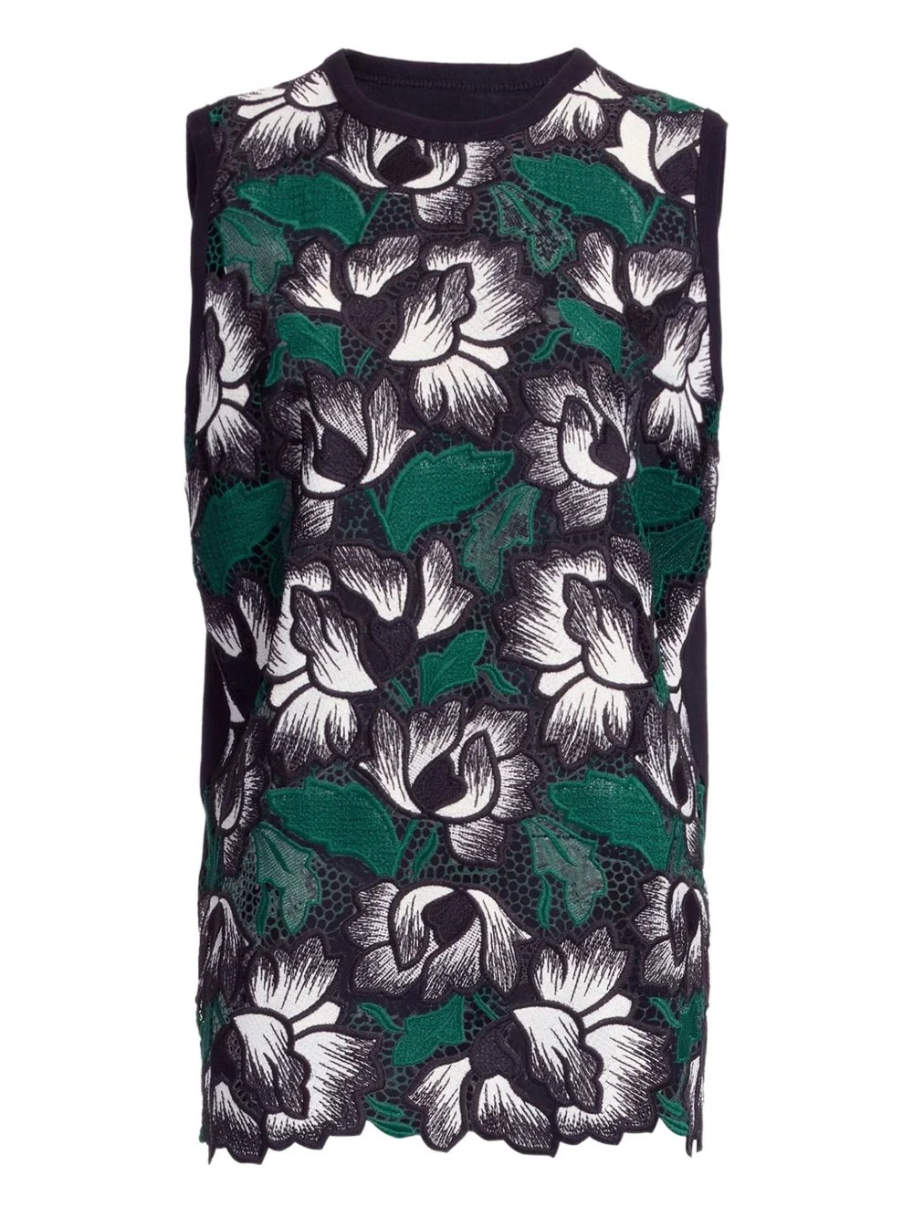 floral macrame top Highlights - Black and multicolour - Floral print - Macrame detailing - Sleeveless - Round neck - Scalloped hem Imported Composition Polyester 100% Washing instructions Read Manufacturer Guidelines