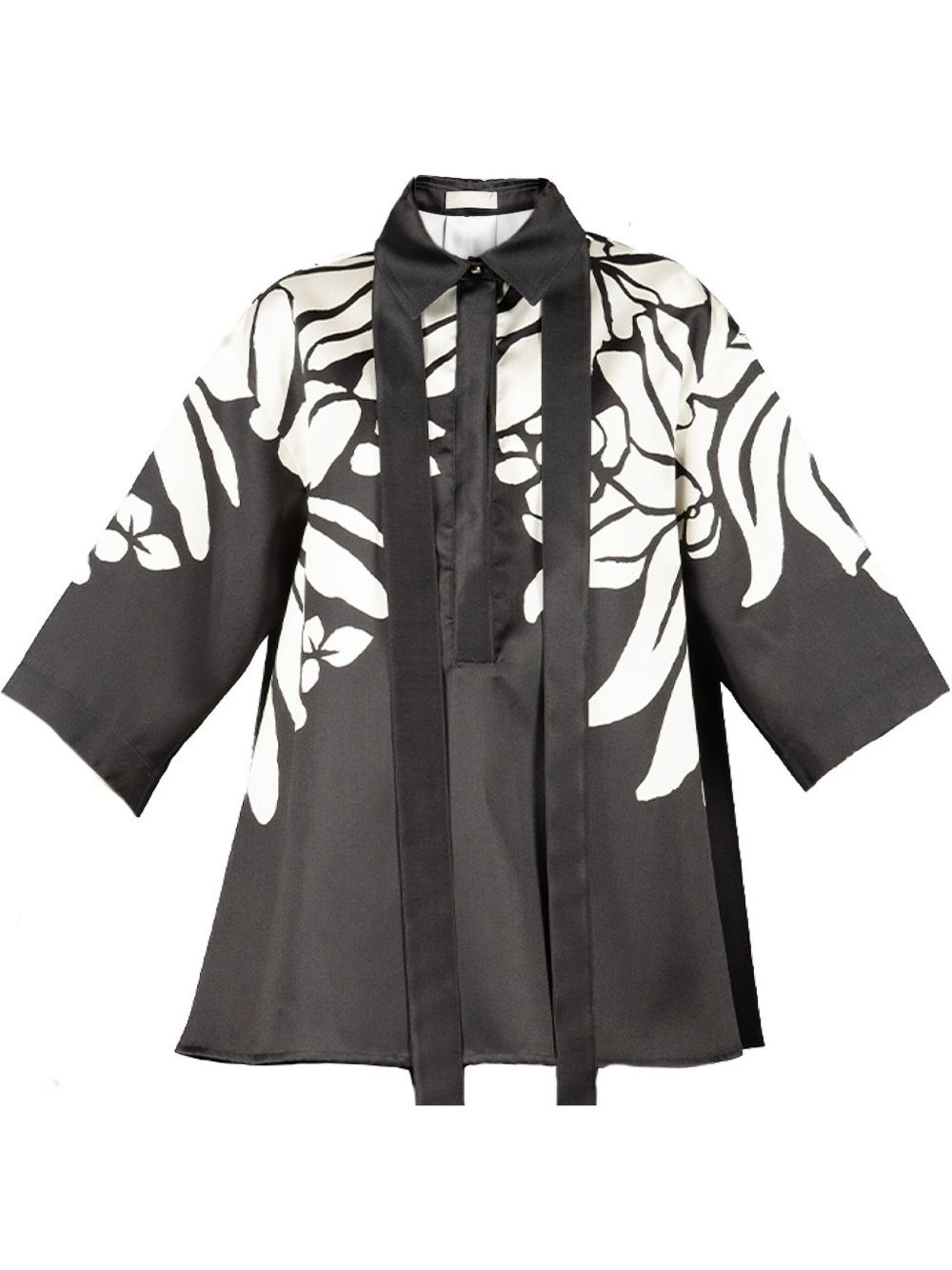 floral-print blouse Highlights - Black - Front button placket - Scarf detailing - Spread collar - Half-length sleeves Imported Composition Polyester 100% Washing instructions Read Manufacturer Guidelines