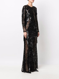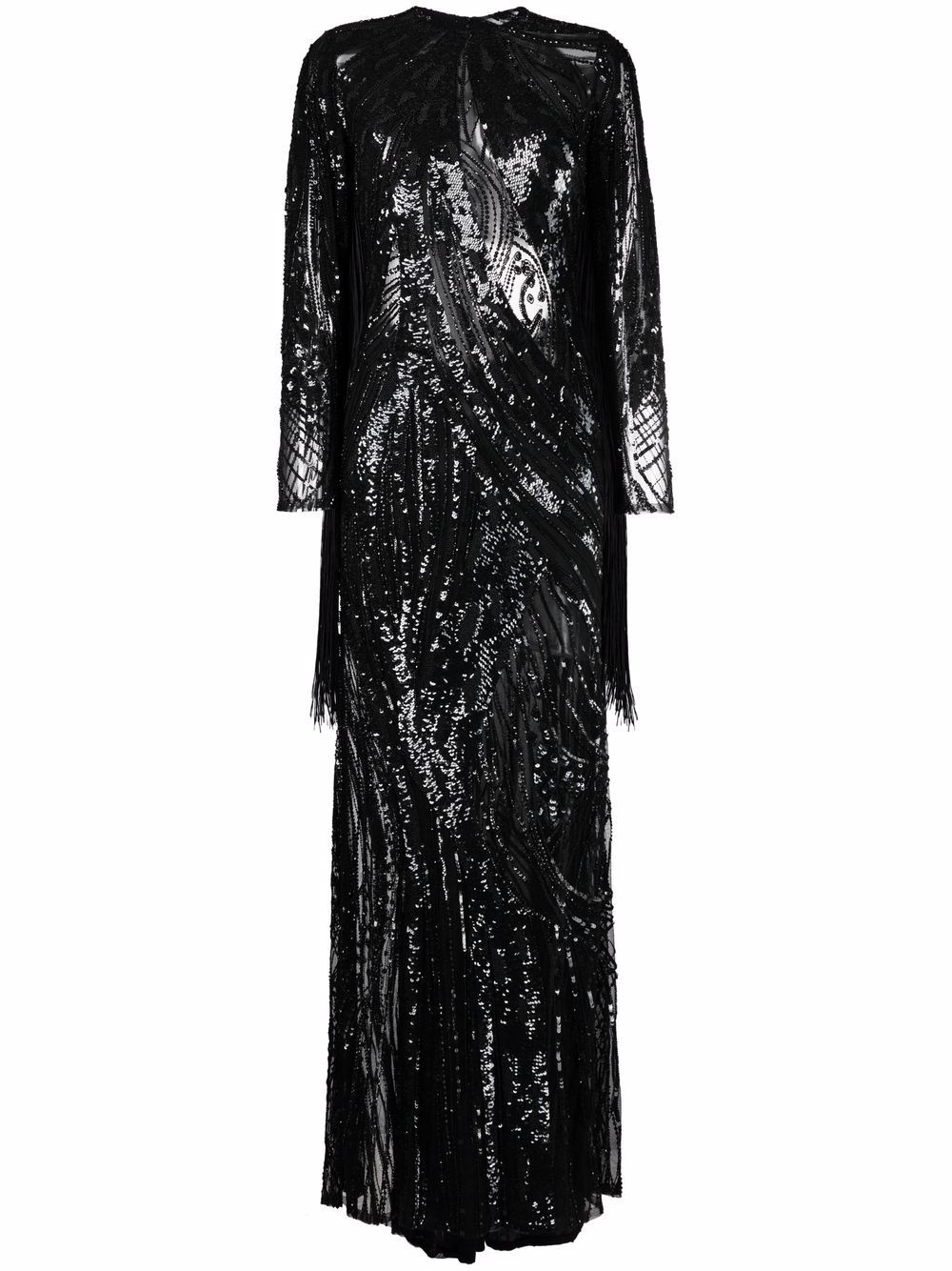 long bead-embellished gown black silk blend bead embellishment fringe detailing open back concealed rear zip fastening round neck long sleeves Imported Composition Outer: Silk 62%, Acetate 26%, Polyamide 12% Lining: Silk 100% SIZE & FIT Model measurements Height 5 ft 10 in(1.78 m) Bust/Chest 33.07 in(84 cm) Hips 35.82 in(91 cm) Waist 25.98 in(66 cm) FittingInformation This piece fits true to size. We recommend you get your regular size Designed for a close fit at the bust, waist and hips Made with a mid-weight fabric Washing instructions Dry Clean Only
