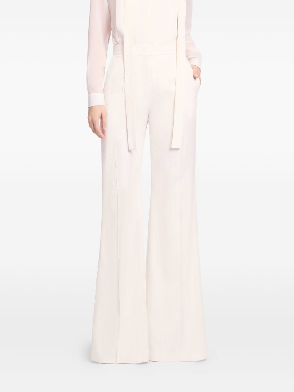 pinstripe trousers Highlights - White - Pinstripe - Flared leg - Side pockets Made in Italy Composition Viscose 95%, Polyamide 3%, Polyester 2% Washing instructions Read Manufacturer Guidelines