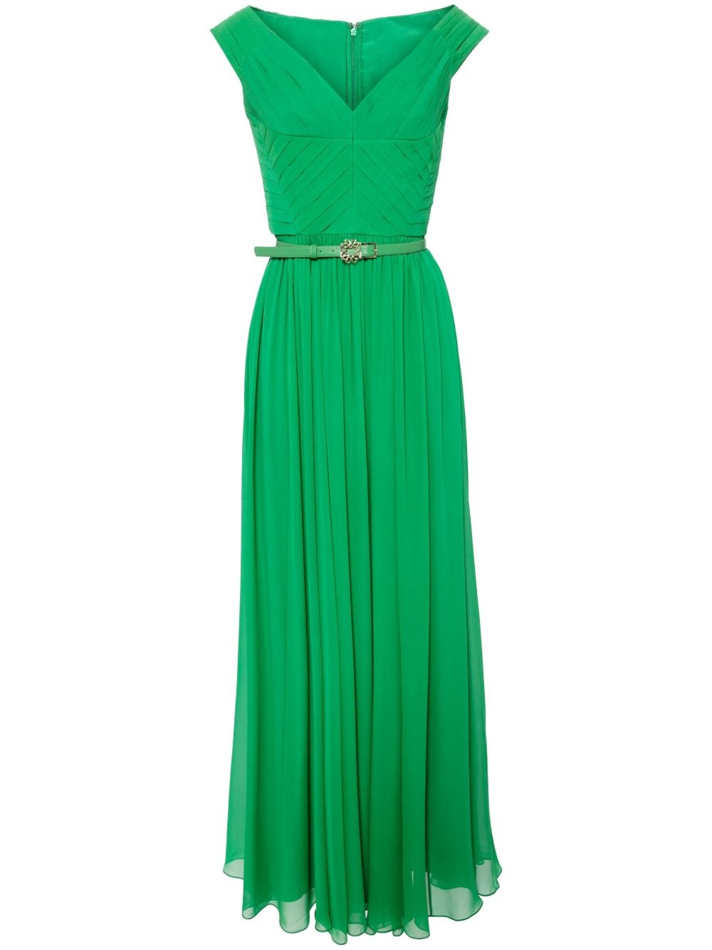 pleated bodice silk dress Highlights - Emerald green - Silk - V-neck - Off-shoulder - Pleated bodice - Detachable belt with monogram buckle - Detachable scarf - Concealed rear zip fastening - Flared design - Silk lining - Floor-length Imported Composition Outer: Silk 100% Lining: Silk 100% SIZE & FIT Model measurements Height 5 ft 10 in(1.77 m) Bust/Chest 30.7 in(78 cm) Hips 35.03 in(89 cm) Waist 23.62 in(60 cm) FittingInformation Designed for a close fit at the chest and waist with a loose fit at the hip The belt offers adjustability for fitted preferences Made from a lightweight non-stretch fabric This piece fits true to size – take your usual size Washing instructions Dry Clean Only
