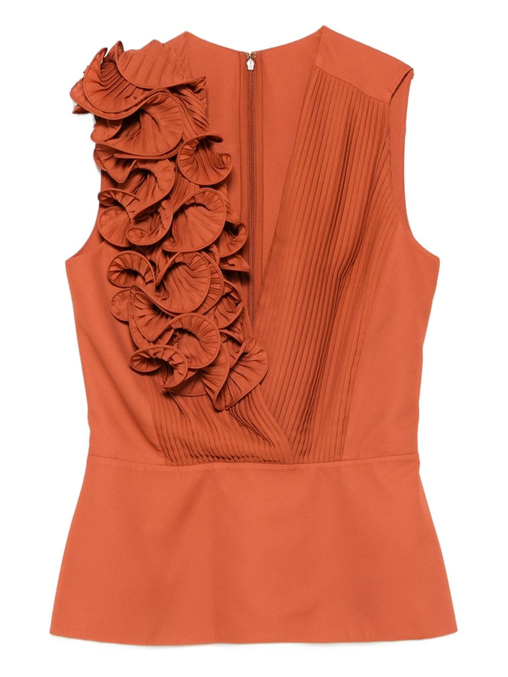 ruffled-pleated top Highlights - Orange - Ruffled embellishment - Sleeveless - Pleated bodice - V-neck - Concealed zip fastening Imported Composition Polyester 100% Washing instructions Dry Clean Only