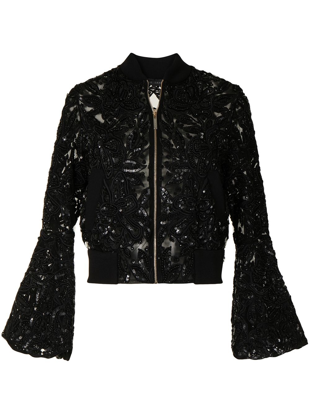 sequin-embellished bell-sleeve jacket black silk sequin embellishment baseball collar front zip fastening bell sleeves front zip fastening straight hem Imported Composition Body: Viscose 74%, Polyamide 23%, Polyester 3% Lining: Silk 100% SIZE & FIT Model measurements Height 6 ft 1 in(1.86 m) Bust/Chest 34.64 in(88 cm) Hips 36.22 in(92 cm) Waist 27.16 in(69 cm) FittingInformation This piece fits true to size. We recommend you get your regular size Cut for a loose fit Made with a heavyweight fabric