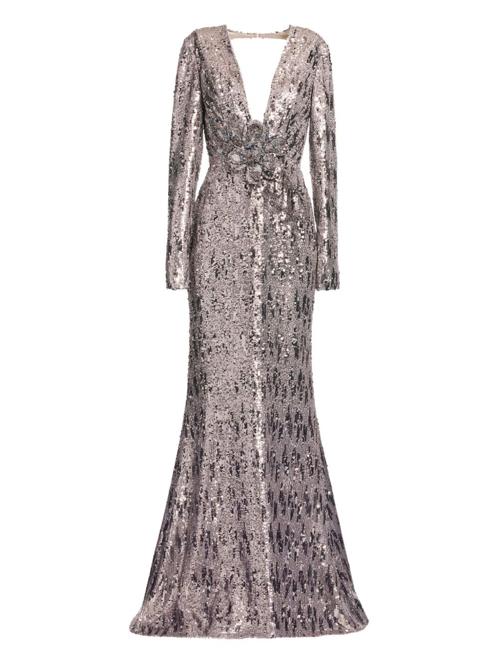 sequin-embellished open-back maxi dress Highlights - Silver-tone - Silk - V-neck - Long sleeves - Open back - Flower detail Imported Composition Outer: Silk 52%, Polyester 44%, Spandex/Elastane 2% Polyamide 2% Washing instructions Read Manufacturer Guidelines