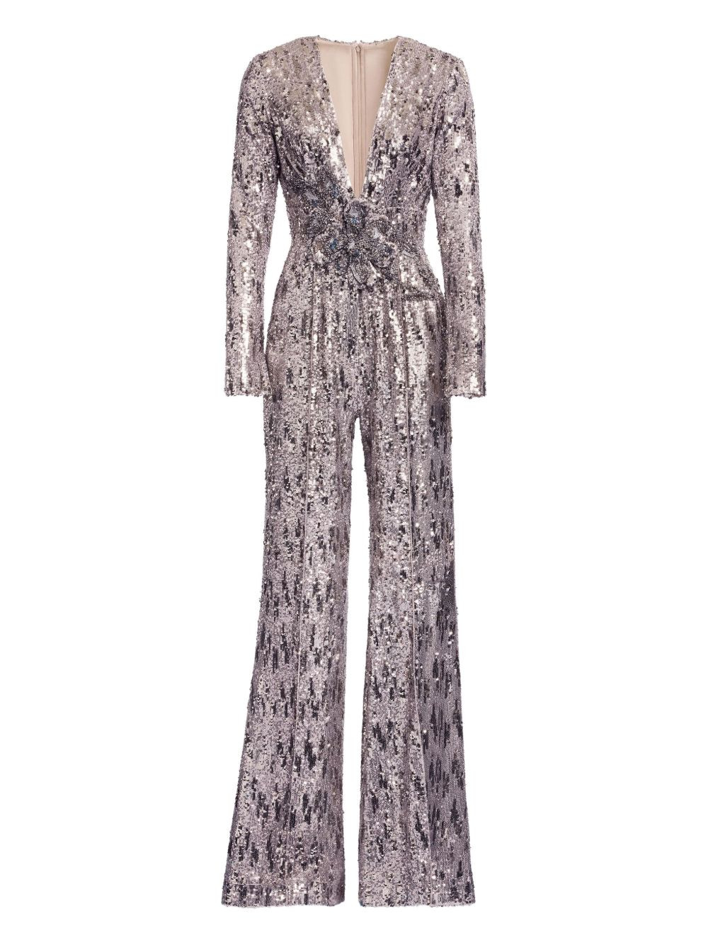 V-neck sequinned jumpsuit Highlights - Grey - Sequin embellishment - V-neck - Long sleeves - Rear zip fastening Imported Composition Polyester 50%, Silk 25%, Polyamide 25% Washing instructions Read Manufacturer Guidelines