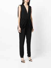 V-plunge cape jumpsuit black silk plunging V-neck sleeveless cape design draped detailing straight leg Imported Composition Body: Silk 61%, Viscose 21%, Acetate 18% Lining: Silk 100% SIZE & FIT Model measurements Height 5 ft 9 in(1.76 m) Bust/Chest 32.28 in(82 cm) Hips 35.03 in(89 cm) Waist 23.62 in(60 cm) FittingInformation This piece fits true to size. We recommend you get your regular size Cut for a slim fit Designed to be fitted at the waist and hips, loose over the leg Made with a mid-weight non-stretch fabric Washing instructions Dry Clean Only