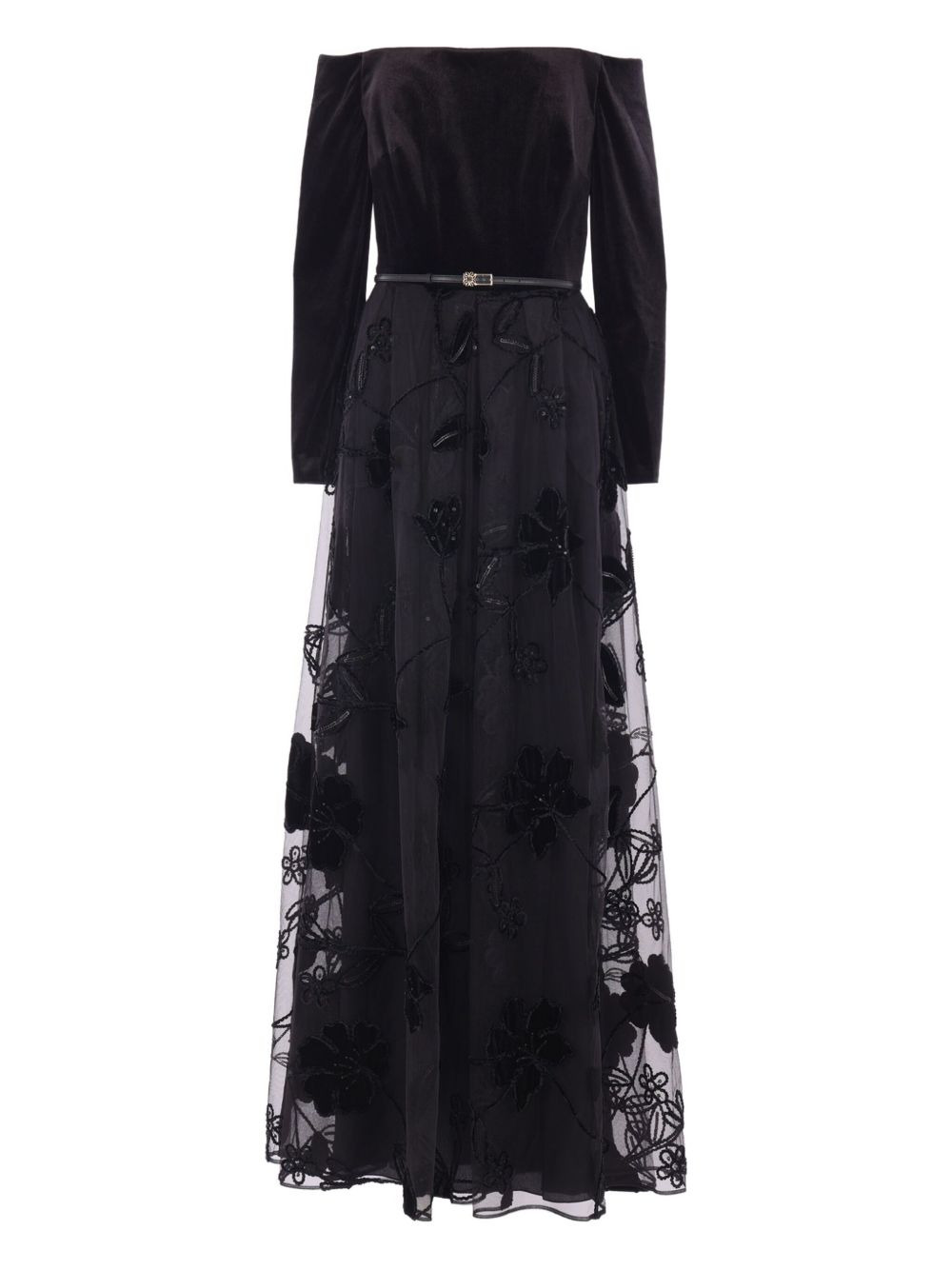 velvet floral-embroidered tulle dress