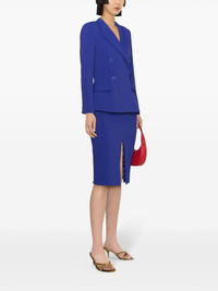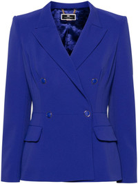 double-breasted peplum blazer Imagined in an eye-catching indigo-blue hue, this blazer by Elisabetta Franchi offers a formal design. Its double-breasted silhouette is structured with shoulder pads and cinched at the waist for a dynamic look. Highlights - Indigo blue - Crepe texture - Logo-embossed buttons - Notched lapels - Double-breasted button fastening - Shoulder pads - Long sleeves - Buttoned cuffs - Two front flap pockets - Peplum hem - American rear vent - Straight hem - Logo-jacquard lining - Gold-tone hardware Made in Italy Composition Lining: Polyester 100% Outer: Polyester 96%, Elastane 4% SIZE & FIT Model measurements Height 5 ft 10 in(1.78 m) Bust/Chest 29.92 in(76 cm) Hips 34.64 in(88 cm) Waist 23.62 in(60 cm) FittingInformation Designed for a slim fit that sits just away from the body offering a close yet comfortable fit The internal shoulder pads offer a structured shape Made from a midweight fabric This piece fits true to size – take your usual size Washing instructions Hand Wash