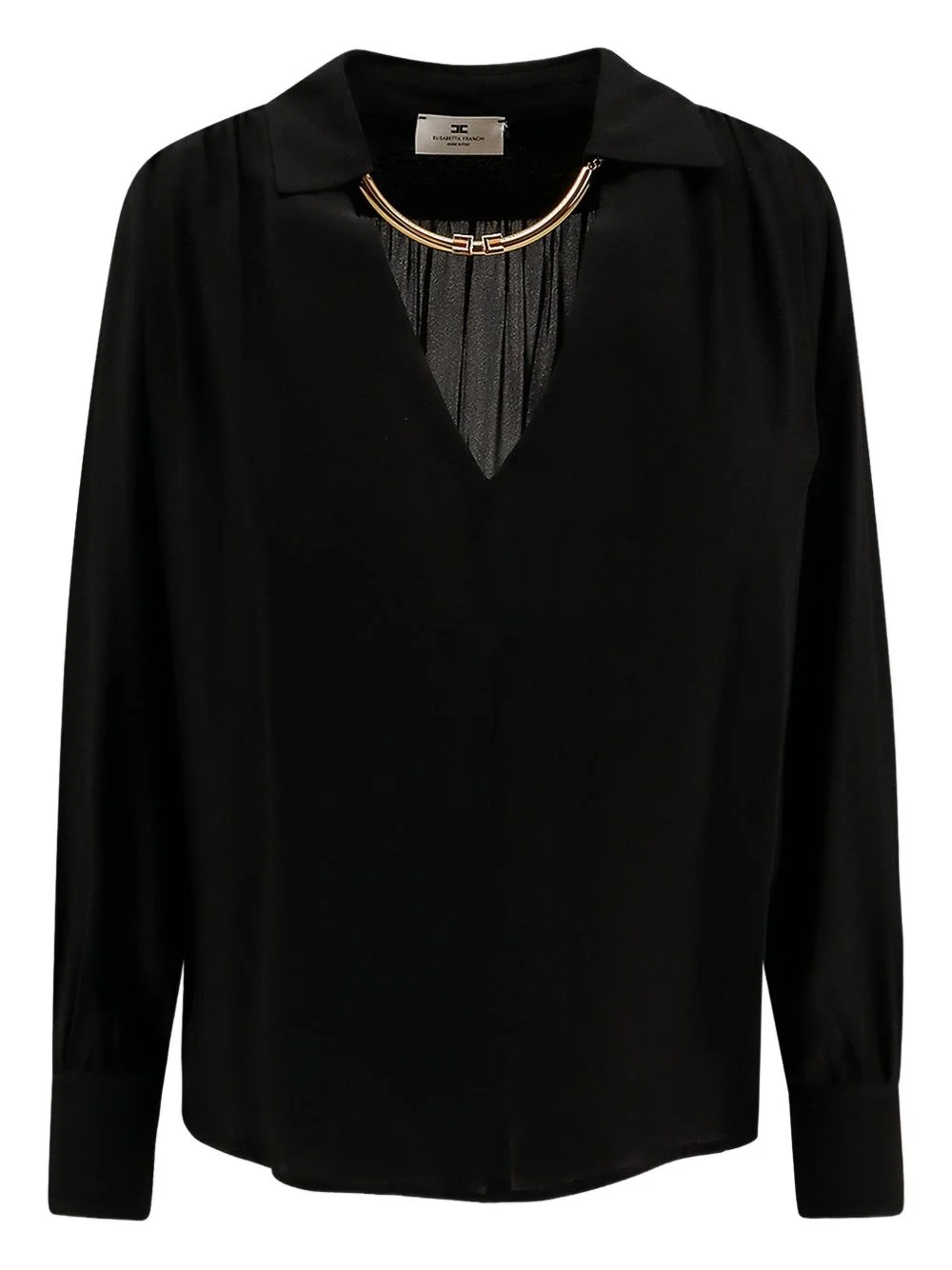 pleated-neck shirt Highlights - Black - Pleated neckline - Long sleeves - Buttoned cuffs - Gold-tone jewel detail Imported Composition Viscose 100% Washing instructions Read Manufacturer Guidelines