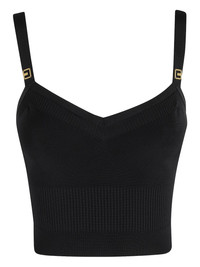 ribbed V-neck top Highlights - Black - Ribbed texture - V-neck - Adjustable straps - Gold-tone clasp details Imported Composition Viscose 80%, Polyamide 20% Washing instructions Read Manufacturer Guidelines