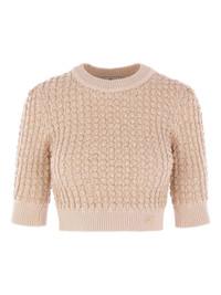 sequin-embellished cable-knit sweater Highlights - Beige - Cable knit - Sequin embellishment - Short sleeves - Round neck Made in Italy Composition Polyester 42%, Viscose 38%, Acrylic 9%, Polyamide 8%, Alpaca 3% Washing instructions Read Manufacturer Guidelines