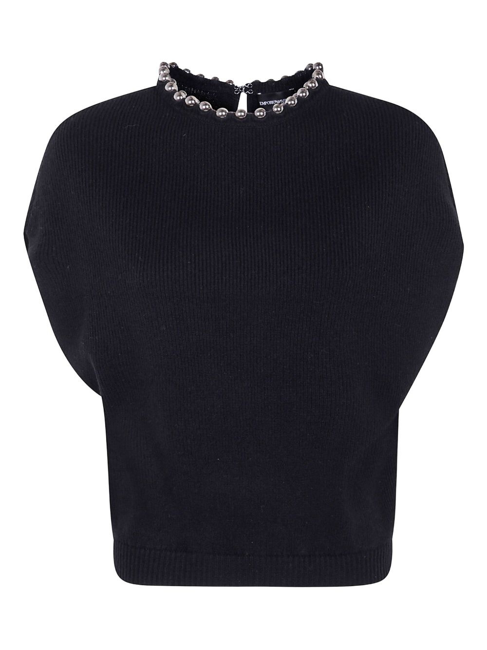 beaded-neck ribbed sweater Highlights - Black - Ribbed knit - Short sleeves - Round neck - Metallic bead embellishment Imported Composition Wool 100% Washing instructions Read Manufacturer Guidelines