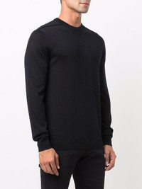 crew-neck jumper navy blue virgin wool blend round neck long sleeves Imported Composition Virgin Wool 60%, Lyocell 40% SIZE & FIT Model measurements Height 6 ft 1 in(1.85 m) Bust/Chest 37.79 in(96 cm) Hips 37.4 in(95 cm) Waist 30.7 in(78 cm) FittingInformation This piece fits true to size. We recommend you get your regular size Cut for a relaxed fit Made with a mid-weight fabric