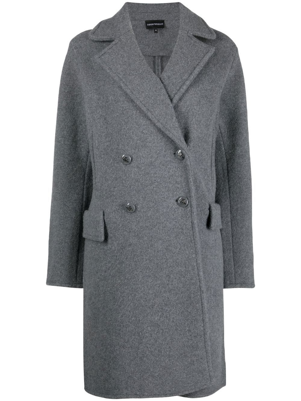 double-breasted coat grey virgin wool blend double-breasted button fastening wide notch lapels two side flap pockets knee-length Imported Composition Virgin Wool 85%, Cotton 15% SIZE & FIT Model measurements Height 5 ft 10 in(1.78 m) Bust/Chest 30.31 in(77 cm) Hips 36.61 in(93 cm) Waist 24.8 in(63 cm) FittingInformation This piece fits true to size. We recommend you get your regular size Cut for a loose fit Made with a mid-weight non-stretch fabric