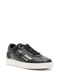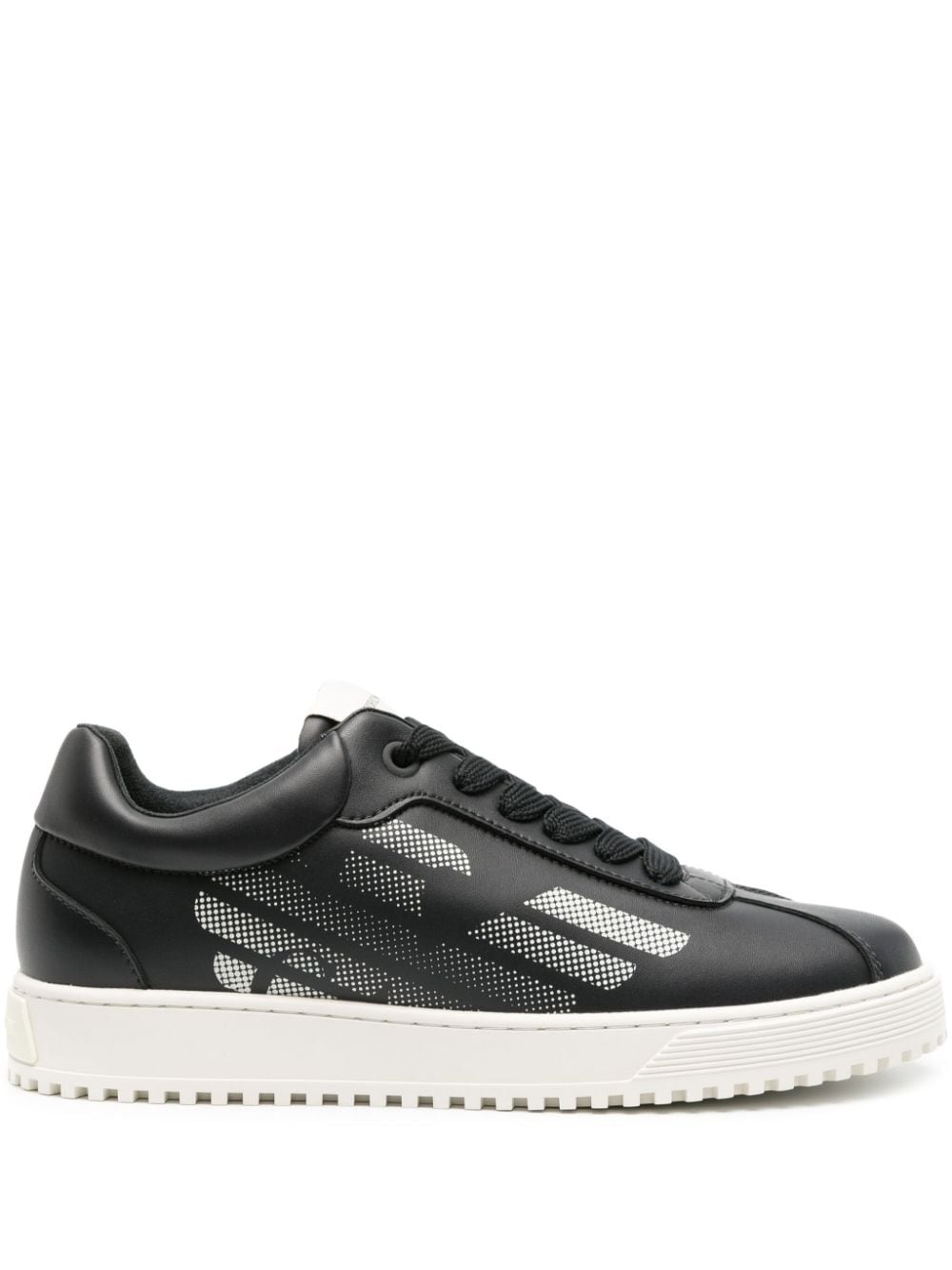 eagle-print leather sneakers Crafted from leather, these sneakers are an instantly recognisable Emporio Armani shoe thanks to the eagle print on the side – a brand's signature. The pair is set on a flat rubber sole and fastened with a front lace-up. Highlights - Navy blue - Calf leather - Logo print to the side - Logo patch at the tongue - Round toe - Front lace-up fastening - Branded insole - Flat rubber sole Imported Composition Outer: Calf Leather 100%, Polyurethane 100% Lining: Fabric 100%, Polyurethane 100% Sole: Rubber 100% SIZE & FIT Measurement HEEL 1.37 in(3.5 cm) Sole height 0.98 in(2.5 cm)