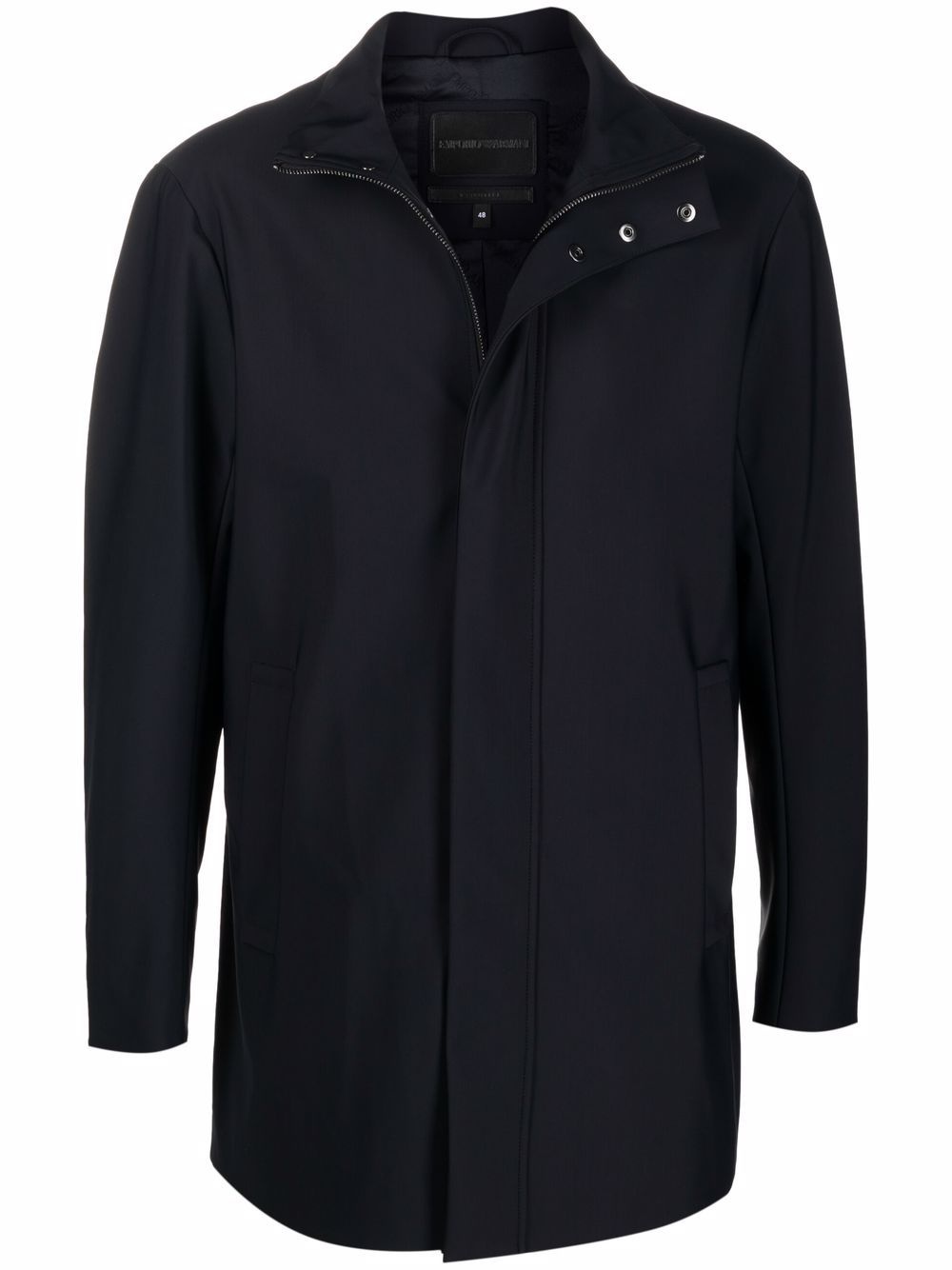 high-neck mid-length coat navy blue high neck concealed front fastening long sleeves two side slit pockets central rear vent Imported Composition Lining: Polyester 100% Outer: Polyester 78%, Spandex/Elastane 22% SIZE & FIT Model measurements Height 6 ft 1 in(1.85 m) Bust/Chest 38.58 in(98 cm) Hips 37 in(94 cm) Waist 30.31 in(77 cm) FittingInformation This piece fits true to size. We recommend you get your regular size Cut for a loose fit Made with a mid-weight fabric