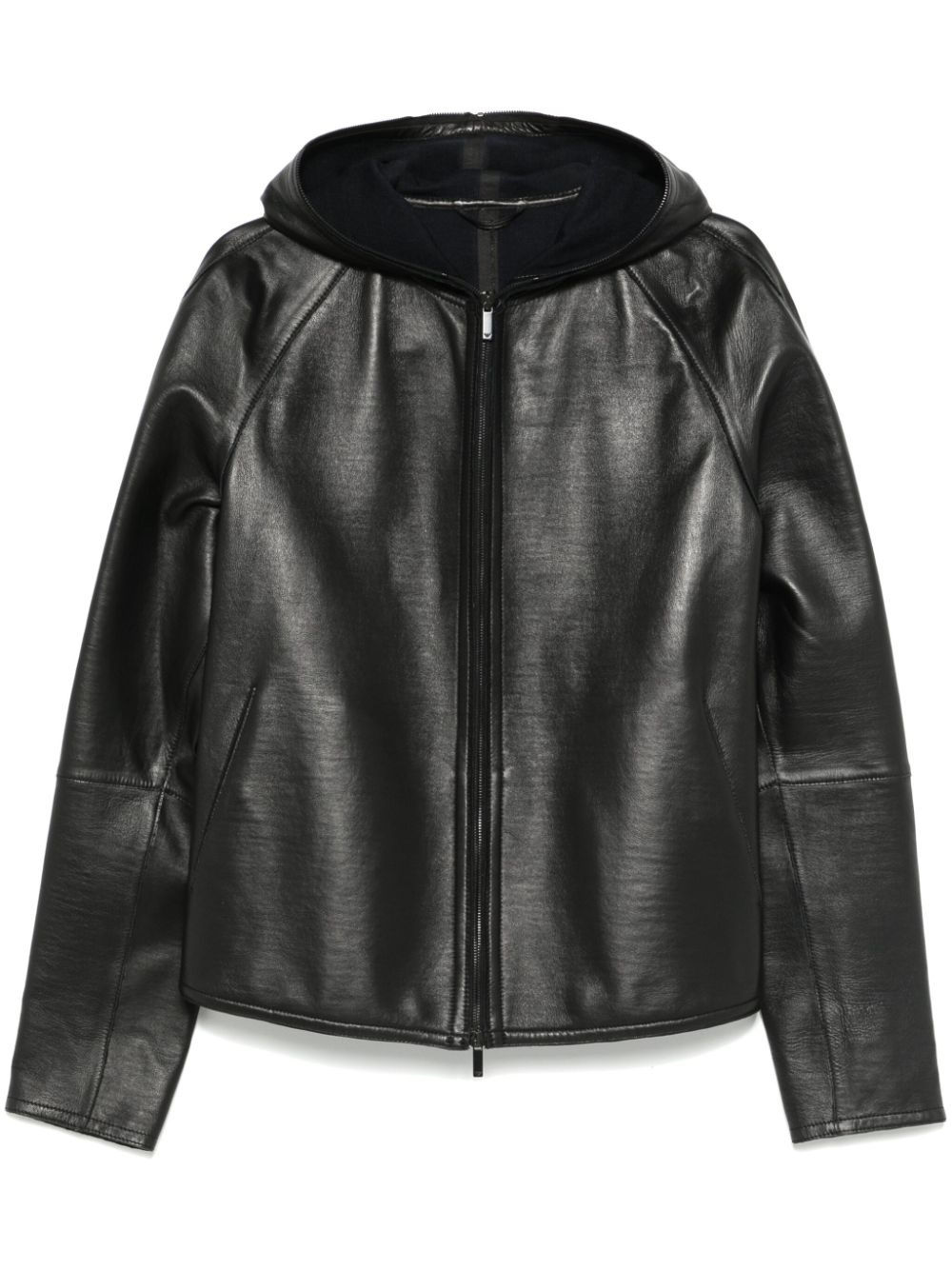 leather jacket Highlights - Black - Concealed front zip fastening - Classic hood - Two side slit pockets - Full lining Imported Composition Outer: Lamb Skin 100% Lining: Acrylic 70%, Wool 30%