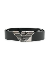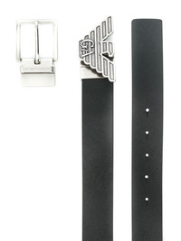 logo buckle belt A contemporary collection infused with the timeless Italian elegance, Emporio Armani combines traditional standards of production with a dash of irreverent attitude. Crafted in Italy from smooth black leather, this logo buckle belt from Emporio Armani features silver-tone hardware, an adjustable fastening, punch hole detailing, a square tip and interchangeable buckle. Made in Italy Composition Calf Leather 100% SIZE & FIT Measurement Minimum Length 41.73 in(106 cm) TOTAL LENGTH 46.06 in(117 cm) WIDTH 1.18 in(3 cm)