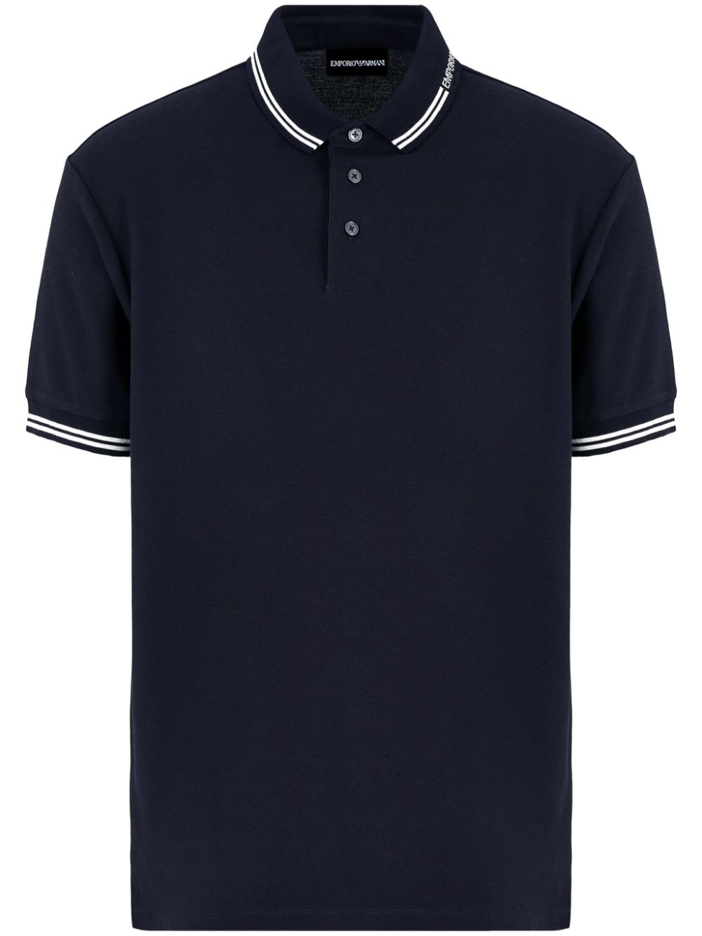 logo-collar polo shirt Highlights - Navy blue/white - Cotton - Pique weave - Intarsia-knit logo - Striped edge - Polo collar - Front button placket - Short sleeves - Straight hem Imported Composition Cotton 100% SIZE & FIT FittingInformation Designed for a regular fit, this polo shirt offers a comfortable loose fit throughout the body Made from a midweight non-stretch fabric, this piece offers minimal elasticity when worn Washing instructions Read Manufacturer Guidelines
