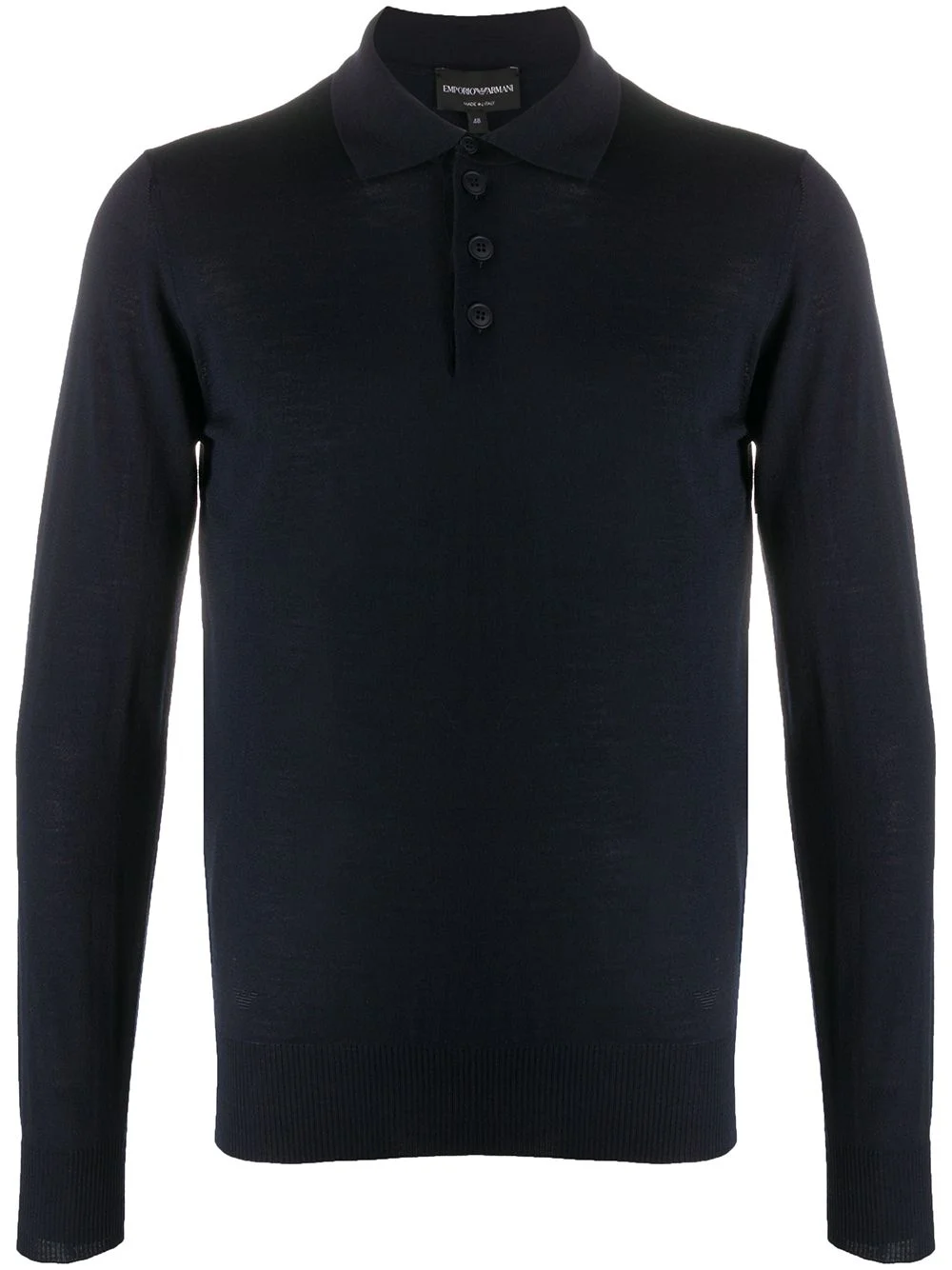long sleeve wool-knit polo shirt Highlights - Dark blue - Virgin wool - Polo collar - Long sleeves - Ribbed cuffs - Straight hem Made in Italy Composition Virgin Wool 100% SIZE & FIT Model measurements Height 6 ft 1 in(1.85 m) Bust/Chest 37.79 in(96 cm) Hips 37.4 in(95 cm) Waist 30.7 in(78 cm) FittingInformation This piece fits true to size. We recommend you get your regular size Cut for a slim fit Made with a mid-weight fabric Washing instructions Dry Clean Only