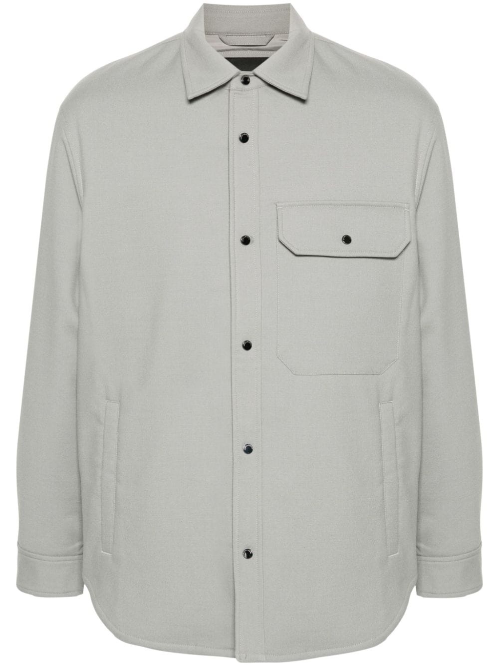 padded shirt jacket Highlights - Cool grey - Interlock twill weave - Padded design - Classic collar - Long sleeves - Press-stud fastening cuffs - Chest flap pocket - Two front welt pockets - Full lining - Curved hem - Silver-tone hardware - Concealed front press-stud fastening Imported Composition Outer: Virgin Wool 40%, Polyester 29%, Elastane 3% Lining: Polyester 100% SIZE & FIT Model measurements Height 6 ft 1 in(1.86 m) Bust/Chest 36.61 in(93 cm) Hips 37 in(94 cm) Waist 28.74 in(73 cm) FittingInformation Designed to be unstructured, offering a loose fit throughout Made from a padded stretch fabric, giving it elasticity and a flexible fit This piece fits true to size – take your usual size