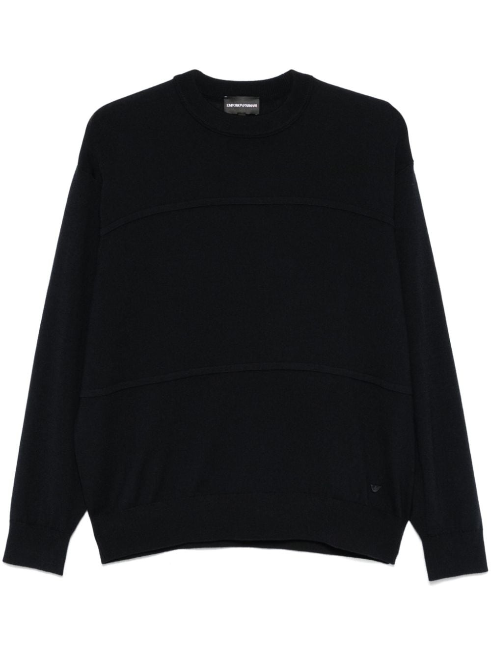 panelled sweater Highlights - Navy blue - Virgin wool - Knitted construction - Panelled design - Ribbed trim - Crew neck - Drop shoulder - Long sleeves - Embroidered logo to the side - Straight hem Imported Composition Virgin Wool 100% SIZE & FIT FittingInformation Designed for a relaxed fit, this piece allows for comfort and movement when worn The ribbed hem offers a close, comfortable fit Made with a midweight knit, this piece offers some stretch