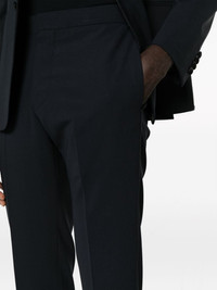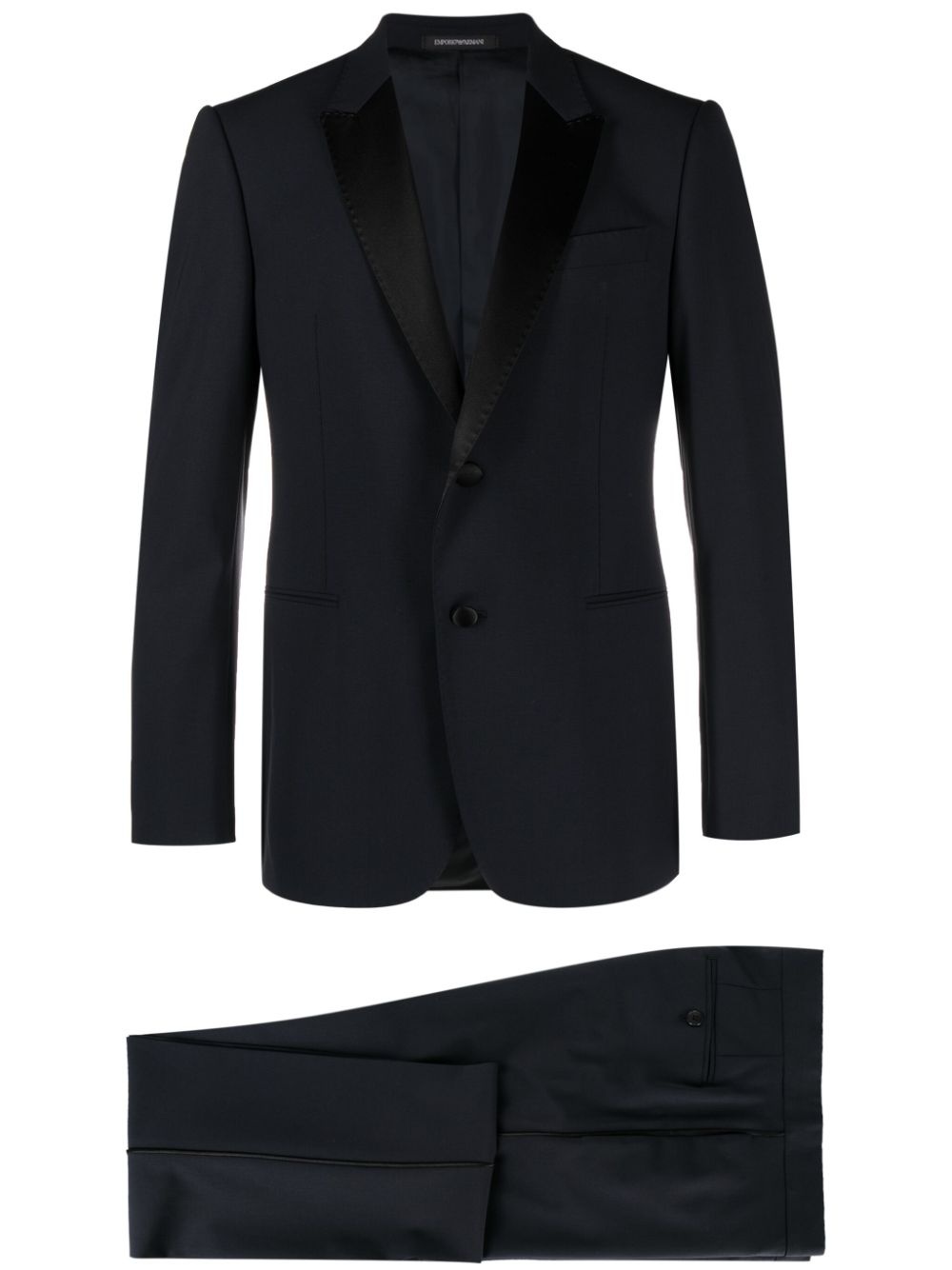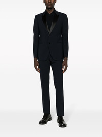 satin-trim single-breasted suit Highlights - Navy blue - Virgin wool blend - Stretch-design Made in Italy Composition Outer: Virgin Wool 96%, Polyester 57%, Silk 43%, Elastane 4% Lining: Viscose 100% SIZE & FIT Model measurements Height 6 ft 2 in(1.87 m) Bust/Chest 36.41 in(92.5 cm) Hips 37 in(94 cm) Waist 29.52 in(75 cm) FittingInformation Tailored for a slim fit, offering a comfortable fit that sits just away from the body The vented hem offers movement at the rear Made from a midweight stretch fabric, this piece offers elasticity and flexibility when worn