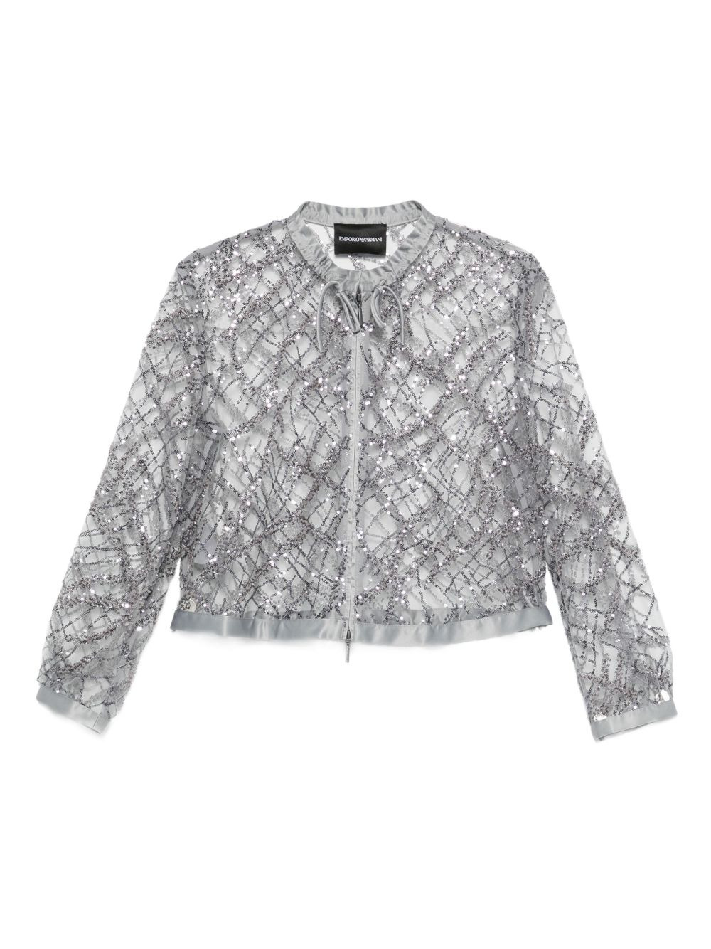 sequin-embellished jacket Highlights - Grey - Sequin embellishment - Front zip fastening - Long sleeves Imported Composition Polyester 100% SIZE & FIT Model measurements Height 5 ft 11 in(1.8 m) Bust/Chest 31.49 in(80 cm) Hips 36.61 in(93 cm) Waist 24.4 in(62 cm) Washing instructions Read Manufacturer Guidelines