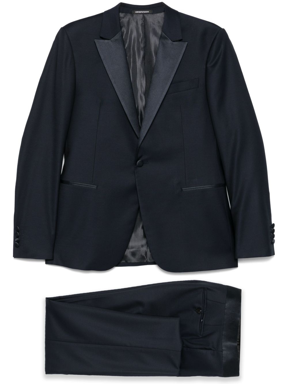 single-breasted suit Highlights - Navy blue - Concealed front button, hook and zip fastening - Chest welt pocket - Two side slash pockets - English rear vents Made in Italy Composition Outer: Polyester 51%, Virgin Wool 48%, Elastane 1% Lining: Polyester 100%, Viscose 100% SIZE & FIT Model measurements Height 6 ft 2 in(1.87 m) Bust/Chest 36.41 in(92.5 cm) Hips 35.43 in(90 cm) Waist 29.52 in(75 cm) FittingInformation Tailored for a slim fit, offering a comfortable fit that sits just away from the body The unfinished hems allow for the length to be altered Made from a midweight non-stretch fabric